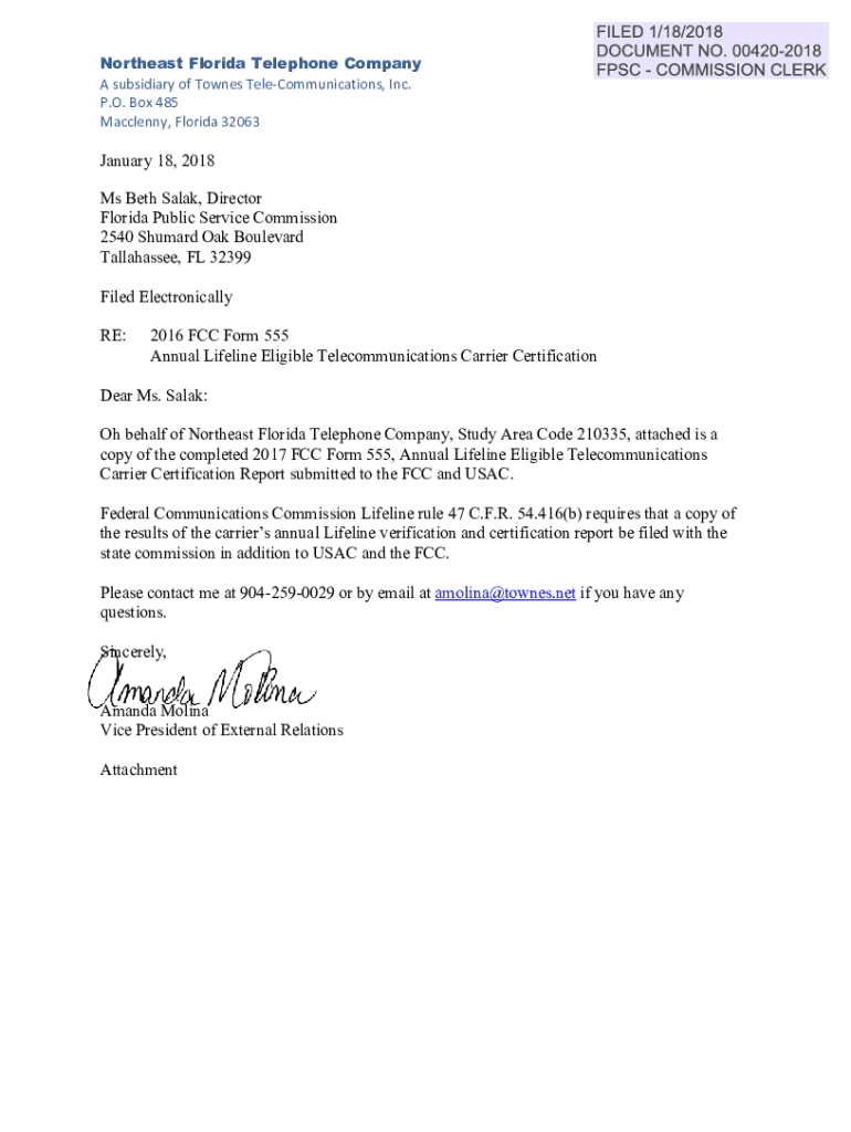 Northeast Florida Telephone Company A subsidiary of Townes Telecommunications, Inc. P.O. Box 485 MacLean, Florida 32063January 18, 2018 Ms Beth Salad, Director Florida Public Service Commission 2540