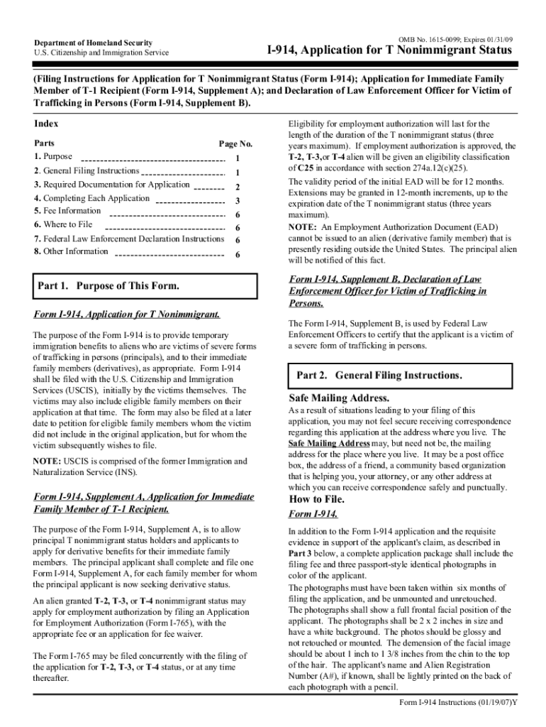OMB No. 16150099; Expires 01/31/09Department of Homeland Security U.S. Citizenship and Immigration ServiceI914, Application for T Nonimmigrant Status(Filing Instructions for Application for T Nonimmigrant