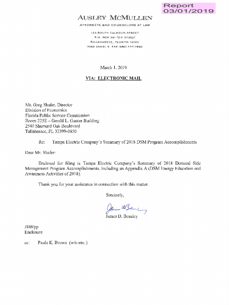 Report 03/01/2.019AUSLEY McMullin ATTORNEYS AND COUNSELORS AT LAW 123 SOUTH CALHOUN STREET. O. BOX 391 (ZIP 32302) TALLAHASSEE, FLORIDA 32301 (850) 2249115FAX (850) 2227560March 1, 2019VIA: ELECTRONIC