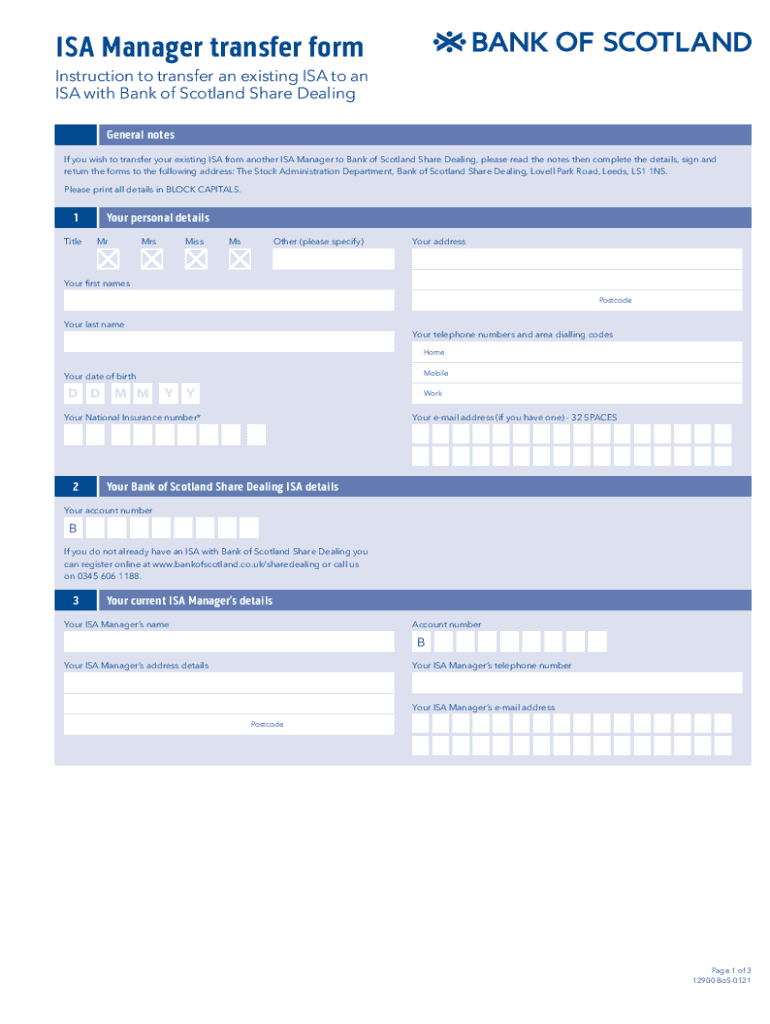 ISA Manager transfer form Instruction to transfer an existing ISA to an ISA with Bank of Scotland Share Dealing General notes If you wish to transfer your existing ISA from another ISA Manager to