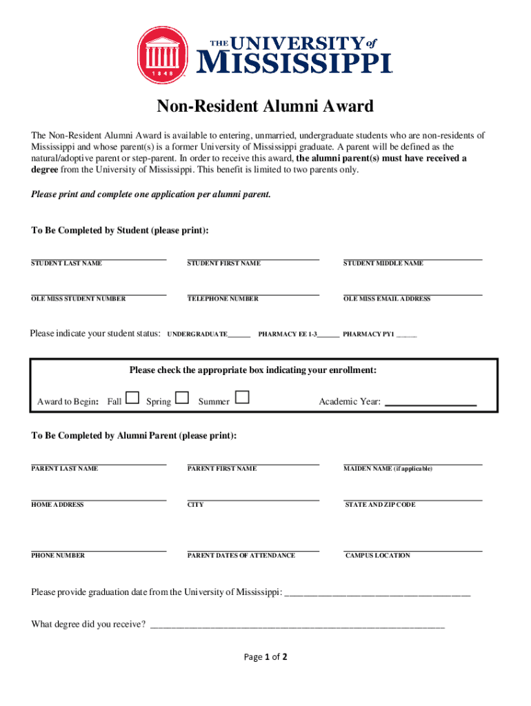 Get the free Nonresident Alumni Award - Eligibility, Application Process, Dates. - finaid olemiss