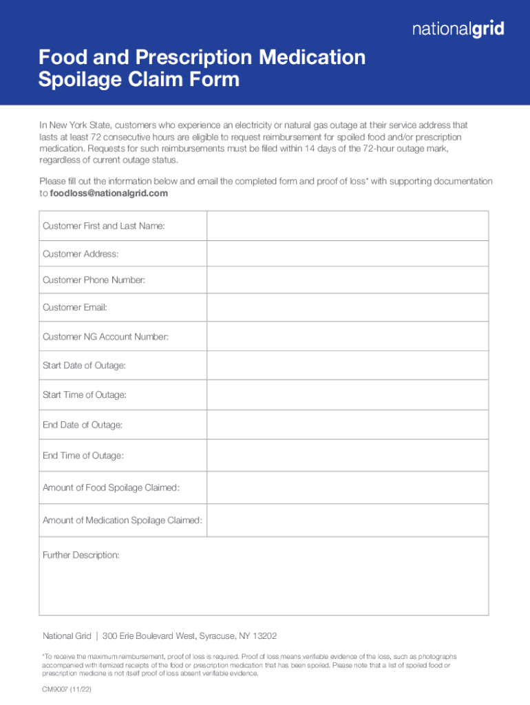 Food and Prescription Medication Spoilage Claim Form In New York State, customers who experience an electricity or natural gas outage at their service address that lasts at least 72 consecutive hours
