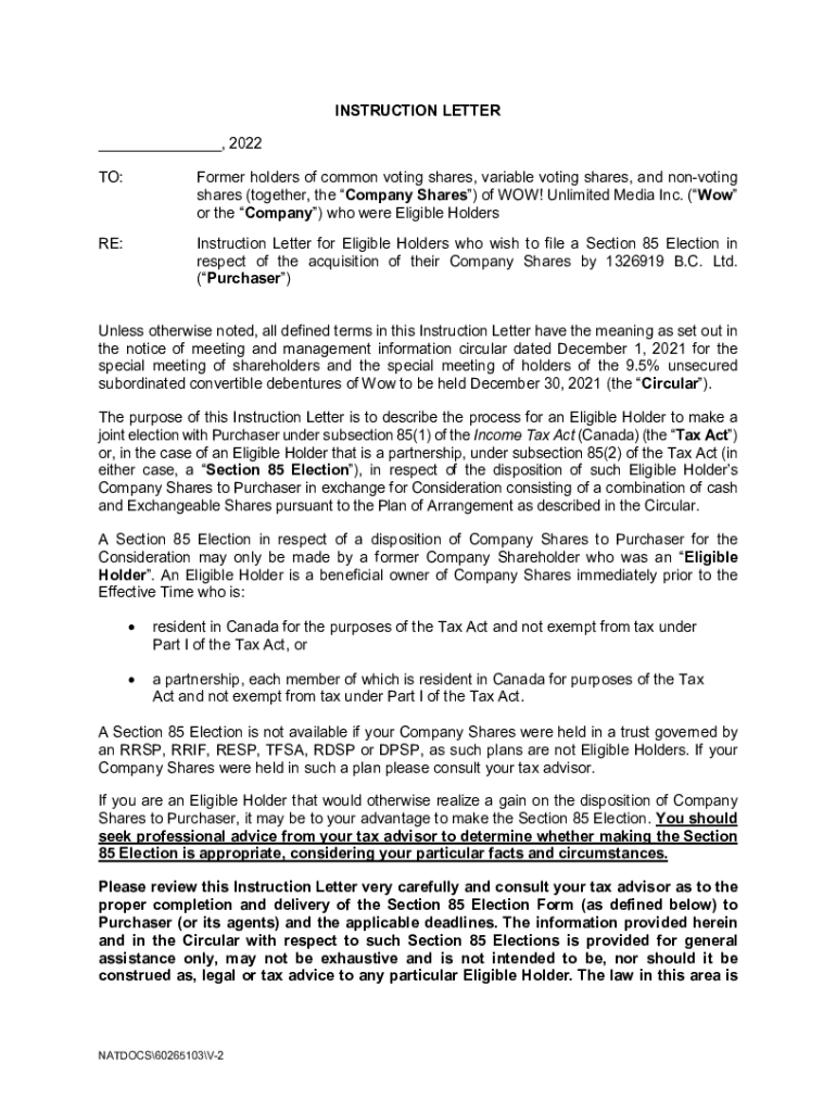 INSTRUCTION LETTER ___, 2022 TO:Former holders of common voting shares, variable voting shares, and nonvoting shares (together, the Company Shares) of WOW! Unlimited Media Inc. (Wow or the Company)