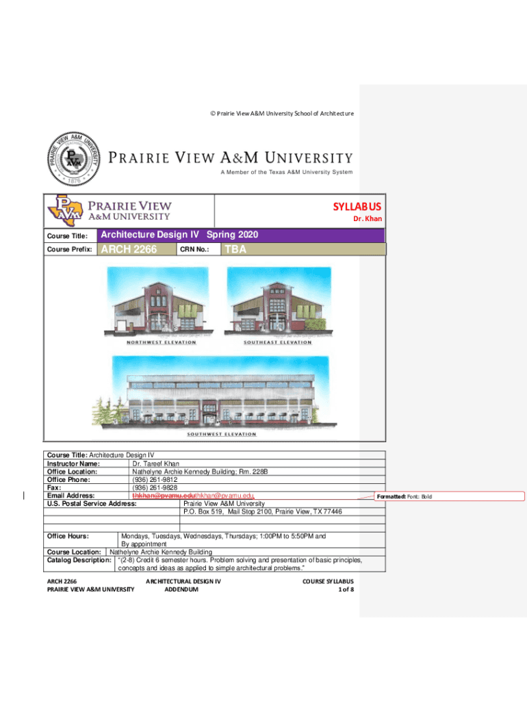 Prairie View A&M University School of ArchitectureSYLLABUS Dr. Khan Course Title:Architecture Design IV Spring 2020Course Prefix:ARCH 2266CRN No.:Course Title: Architecture Design IV Instructor Name: