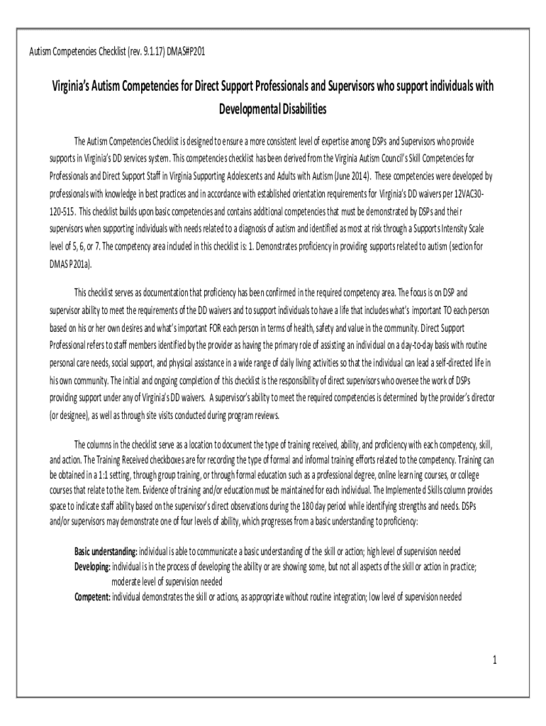 Autism Competencies Checklist (rev. 9.1.17) DMS#P201Virginias Autism Competencies for Direct Support Professionals and Supervisors who support individuals with Developmental Disabilities The Autism