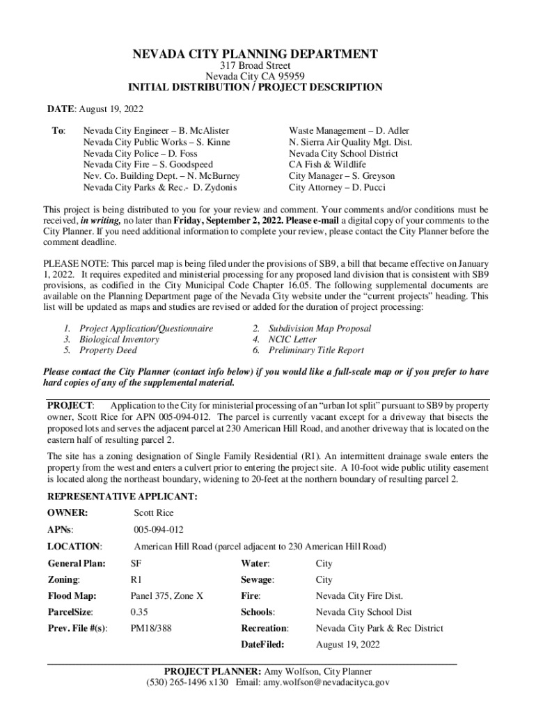 NEVADA CITY PLANNING DEPARTMENT 317 Broad Street Nevada City CA 95959 INITIAL DISTRIBUTION / PROJECT DESCRIPTION DATE: August 19, 2022, To:Nevada City Engineer B. McAlister Nevada City Public Works