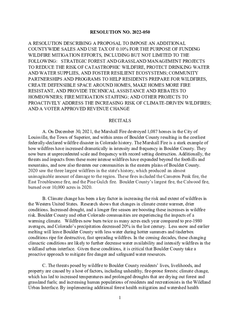 RESOLUTION NO. 2022050 A RESOLUTION DESCRIBING A PROPOSAL TO IMPOSE AN ADDITIONAL COUNTYWIDE SALES AND USE TAX OF 0.10% FOR THE PURPOSE OF FUNDING WILDFIRE MITIGATION EFFORTS, INCLUDING BUT NOT LIMITED