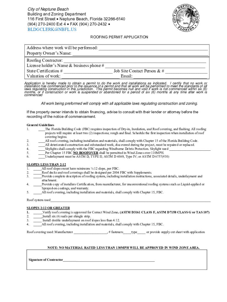 City of Neptune Beach Building and Zoning Department 116 First Street Neptune Beach, Florida 322666140 (904) 2702400 Ext 4 FAX (904) 2702432 BLDGCLERK@NBFL.US ROOFING PERMIT APPLICATIONAddress where