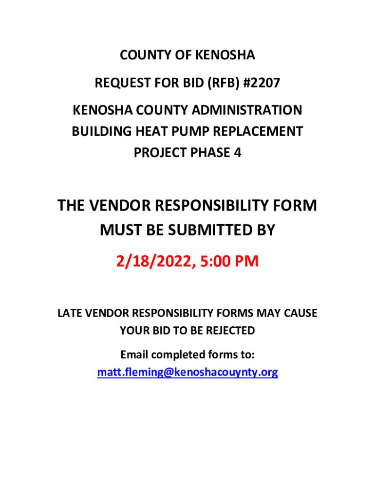 COUNTY OF KENOSHA REQUEST FOR BID (ROB) #2207 KENOSHA COUNTY ADMINISTRATION BUILDING HEAT PUMP REPLACEMENT PROJECT PHASE 4THE VENDOR RESPONSIBILITY FORM MUST BE SUBMITTED BY 2/18/2022, 5:00 PM LATE