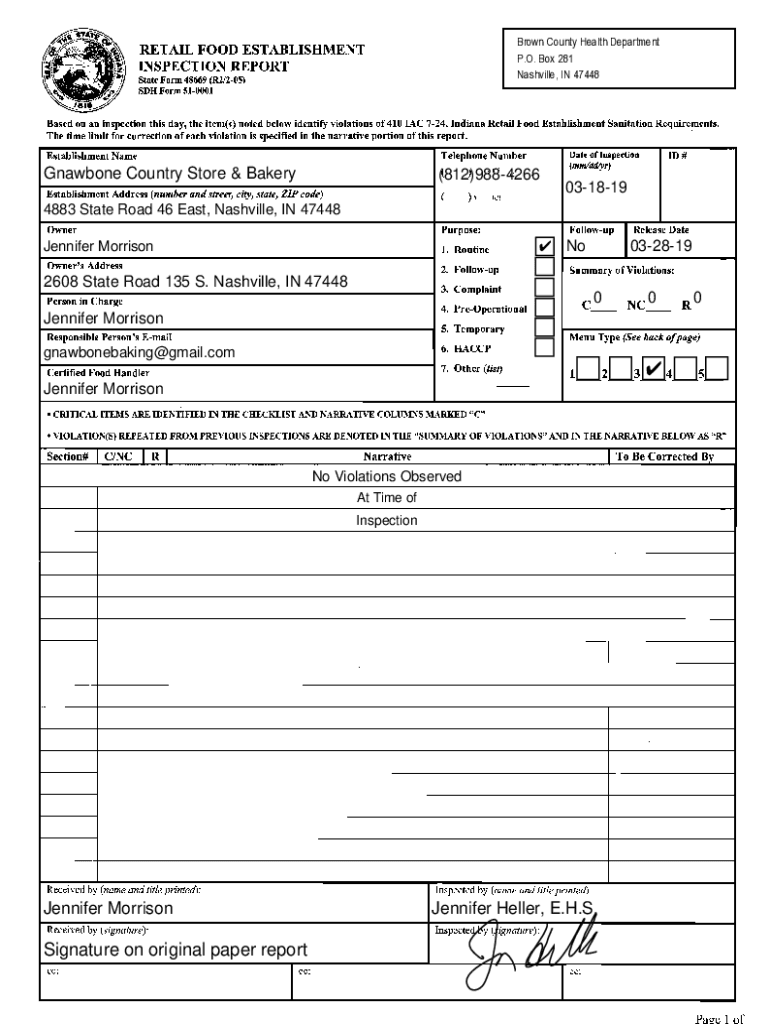 Brown County Health Department P.O. Box 281 Nashville, IN 47448RETAIL FOOD ESTABLISHMENT INSPECTION REPORT State Form 48669 (R2/205) SDH Form 510001Based on an inspection this day, the item’s noted