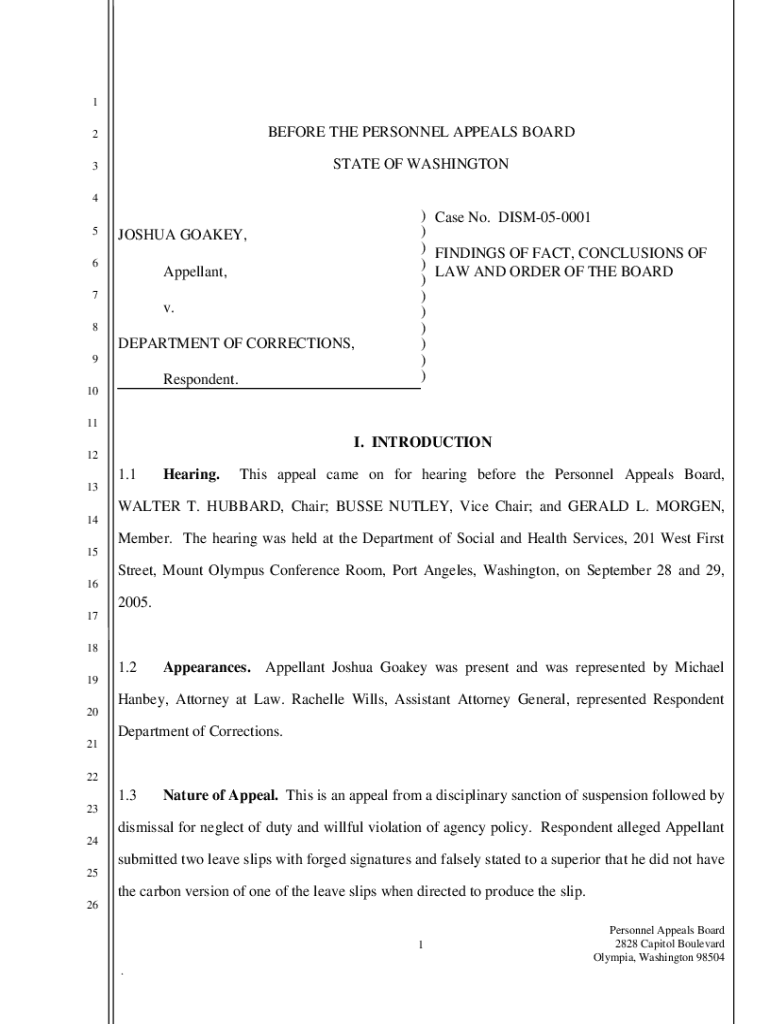 1 2BEFORE THE PERSONNEL APPEALS BOARD3STATE OF WASHINGTON4 5JOSHUA HOCKEY,6Appellant,7v. 8DEPARTMENT OF CORRECTIONS, 9Respondent.10) Case No. DISM050001)) FINDINGS OF FACT, CONCLUSIONS OF) LAW AND