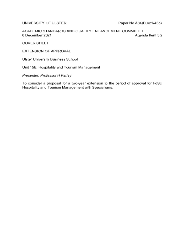 UNIVERSITY OF Wastepaper No ASQ EC/21/45b)ACADEMIC STANDARDS AND QUALITY ENHANCEMENT COMMITTEE 8 December 2021 Agenda Item 5.2 COVER SHEET EXTENSION OF APPROVAL Ulster University Business School Unit