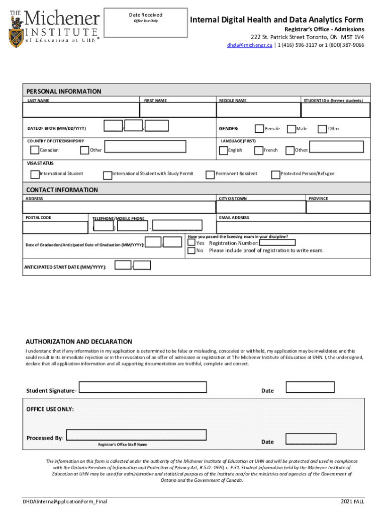 Date Received Office Use OnlyInternal Digital Health and Data Analytics Form Registrars Office Admissions 222 St. Patrick Street Toronto, ON M5T 1V4 dhda@michener.ca 1 (416) 5963117 or 1 (800) 3879066PERSONAL