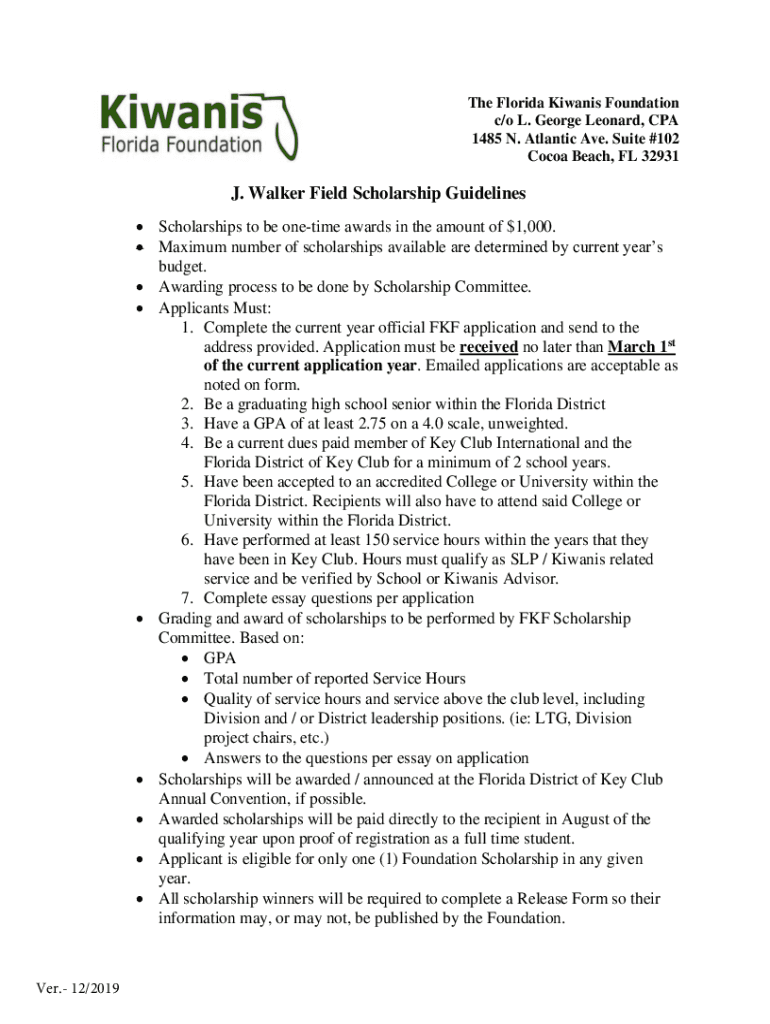 The Florida Kiwanis Foundation c/o L. George Leonard, CPA 1485 N. Atlantic Ave. Suite #102 Cocoa Beach, FL 32931J. Walker Field Scholarship Guidelines Scholarships to be onetime awards in the amount