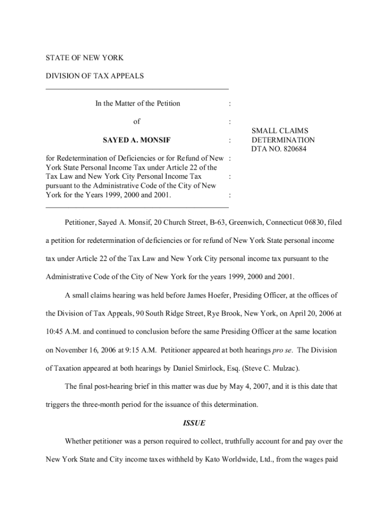 STATE OF NEW YORK DIVISION OF TAX APPEALS ___ In the Matter of the Petition:of: :STAYED A. MONSIFSMALL CLAIMS DETERMINATION DTA NO. 820684for Redetermination of Deficiencies or for Refund of New :