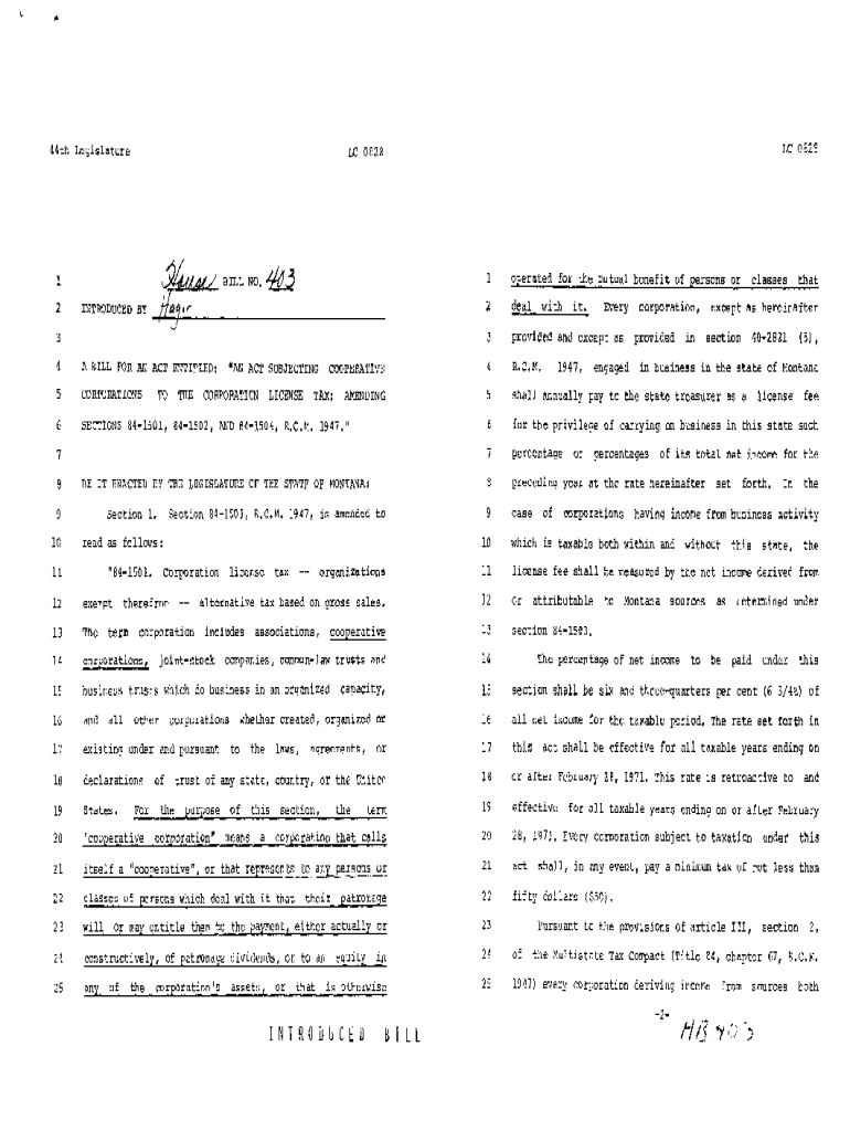 .44th LegislatureamNo.1ill12LC 0828LC 0328INTRODUCED BY \'4A Ball FOR AN ACT ENTITLED:5CORPORATIONS6SECTIONS 841501, 841502, AND 841504,TITHE\” AN ACT SUBJECTINGCORPORATIONLICENSECOOPERATIVETAX;R.C.1.AMENDING1947.\”