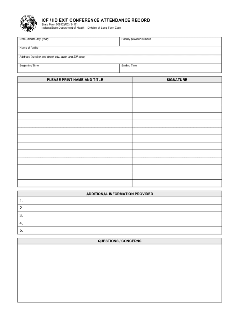 Reset Formic / DID EXIT CONFERENCE ATTENDANCE RECORD State Form 50812 (R2 / 617) Indiana State Department of Health Division of Long Term Capability provider numerate (month, day, year) Name of facility