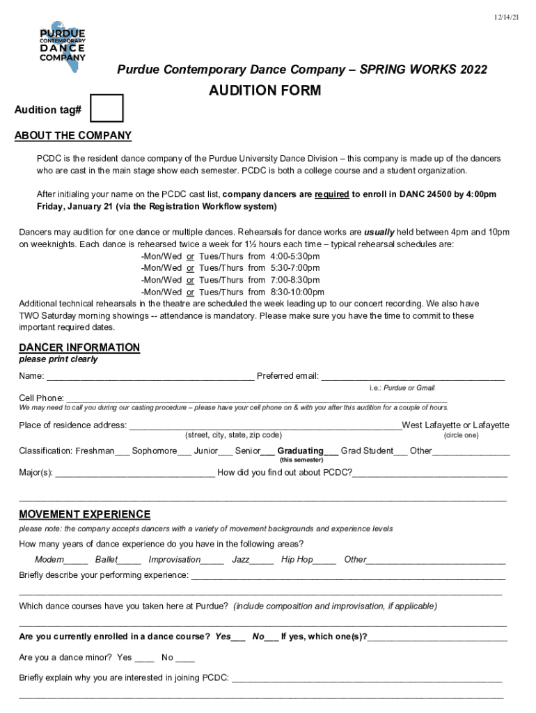 12/14/21Purdue Contemporary Dance Company SPRING WORKS 2022AUDITION FORM Audition tag# ABOUT THE COMPANY CDC is the resident dance company of the Purdue University Dance Division this company is made