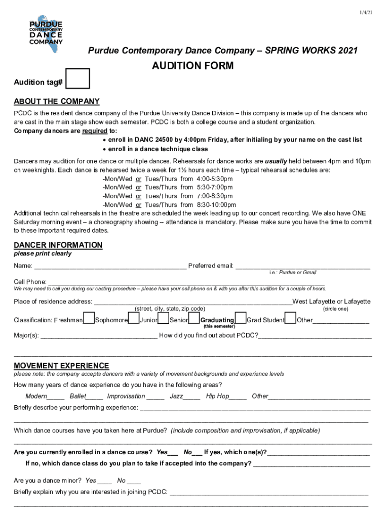 1/4/21Purdue Contemporary Dance Company SPRING WORKS 2021AUDITION FORM Audition tag# ABOUT THE COMPANY CDC is the resident dance company of the Purdue University Dance Division this company is made
