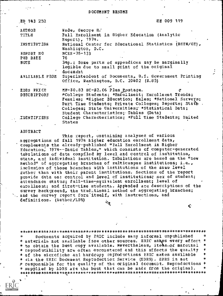 DOCUMENT RESUME HE 009 119ED 143 252 AUTHOR TITLE INSTITUTIONREPORT NO PUB DATE NOTEAVAILABLE FROM EARS PRICE DESCRIPTORSIDENTIFIERSWade, George H.\'Fall Enrollment in Higher Education (Analytic Report),