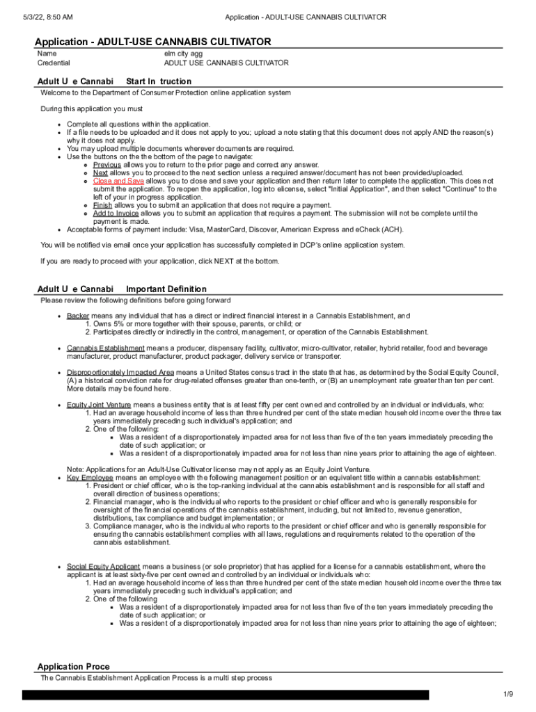 5/3/22, 8:50 Application ADULT USE CANNABIS CULTIVATORApplication ADULT USE CANNABIS CULTIVATOR Name CredentialAdult U e Cannabis city AGG ADULT USE CANNABIS CULTIVATORS tart In tructionWelcome to