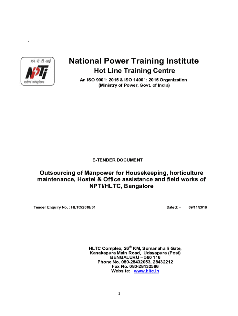 National Power Training Institute Hot Line Training Center An ISO 9001: 2015 & ISO 14001: 2015 Organization (Ministry of Power, Govt. of India)TENDER DOCUMENTOutsourcing of Manpower for Housekeeping,