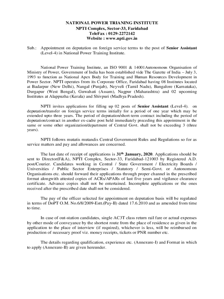 NATIONAL POWER TRIALING INSTITUTE NPAI Complex, Sector33, Faridabad TeleFax : 01292272142 Website : www.npti.gov.in Sub.: Appointment on deputation on foreign service terms to the post of Senior Assistant
