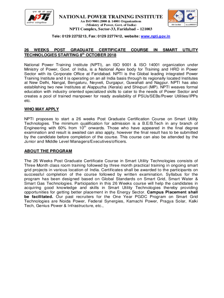NATIONAL POWER TRAINING INSTITUTE An ISO 9001:2000 & 14001 Organizations (Ministry of Power, Govt. of India)NPAI Complex, Sector33, Faridabad 121003 Tell: 0129 2275213, Fax: 0129 2277412, website: