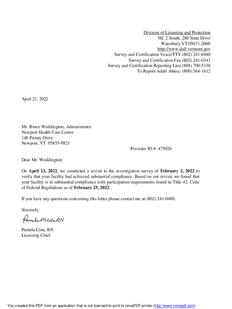 Get the free Newport Health Care - Revisit Survey Division of Licensing ... - Vermont