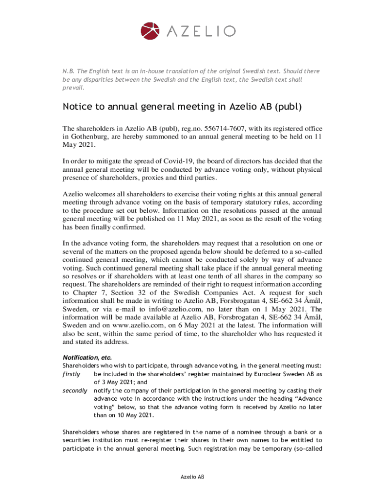 N.B. The English text is an in house translation of the original Swedish text. Should there be any disparities between the Swedish and the English text, the Swedish text shall prevail. Notice to annual