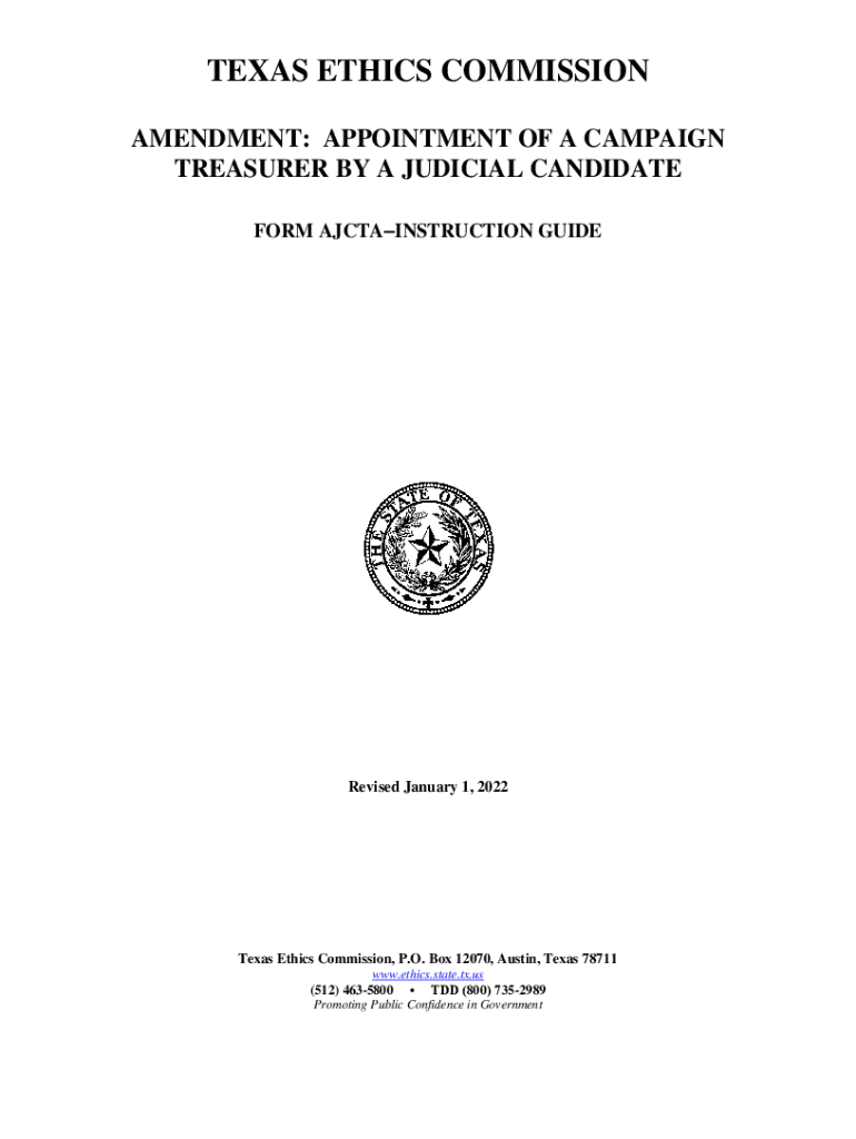 TEXAS ETHICS COMMISSION AMENDMENT: APPOINTMENT OF A CAMPAIGN TREASURER BY A JUDICIAL CANDIDATE FORM AJCTAINSTRUCTION GUIDERevised January 1, 2022Texas Ethics Commission, P.O. Box 12070, Austin, Texas
