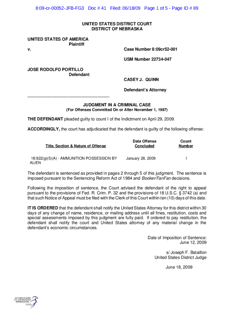 8:09cr00052JFBFG3 Doc # 41 Filed: 06/18/09-Page 1 of 5-Page ID # 89 UNITED STATES DISTRICT COURT DISTRICT OF NEBRASKA UNITED STATES OF AMERICA Plaintiff v. Case Number 8:09cr52001 US Number 22734047JOSE