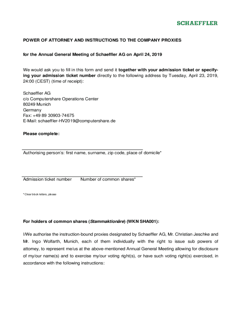 POWER OF ATTORNEY AND INSTRUCTIONS TO THE COMPANY PROXIES for the Annual General Meeting of Schaeffer AG on April 24, 2019We would ask you to fill in this form and send it together with your admission