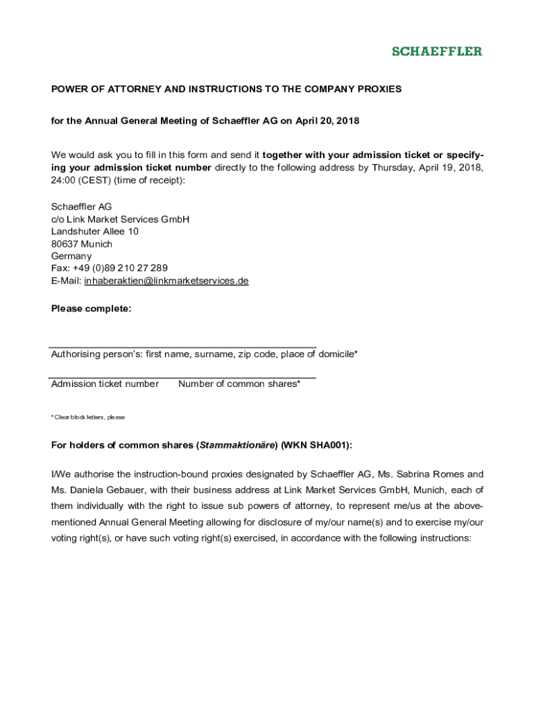 POWER OF ATTORNEY AND INSTRUCTIONS TO THE COMPANY PROXIES for the Annual General Meeting of Schaeffer AG on April 20, 2018, We would ask you to fill in this form and send it together with your admission