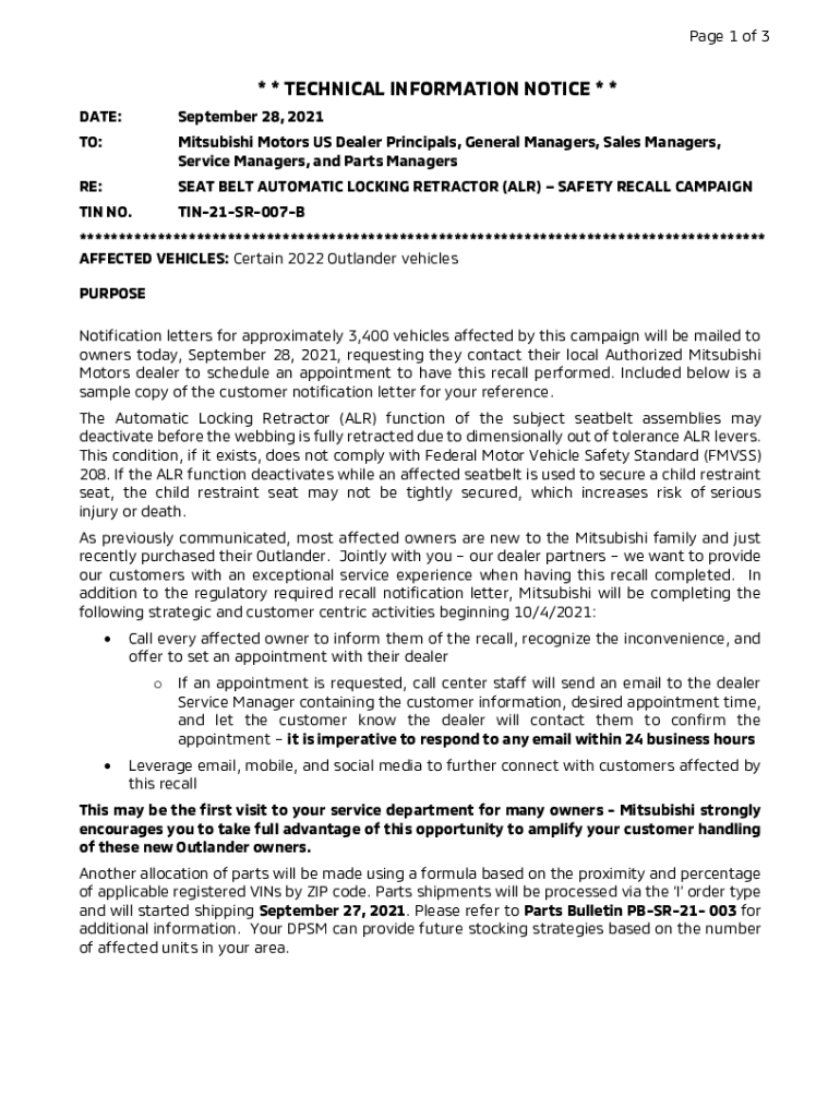 Page 1 of 3* * TECHNICAL INFORMATION NOTICE * * DATE:September 28, 2021TO:Mitsubishi Motors US Dealer Principals, General Managers, Sales Managers, Service Managers, and Parts Managers RE:SEAT BELT