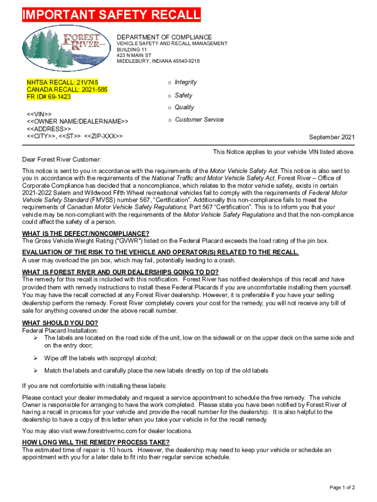 IMPORTANT SAFETY RECALL DEPARTMENT OF COMPLIANCEVEHICLE SAFETY AND RECALL MANAGEMENT BUILDING 11 423 N MAIN ST MIDDLEBURY, INDIANA 465409218NHTSA RECALL: 21V745 CANADA RECALL: 2021585 FR ID# 691423