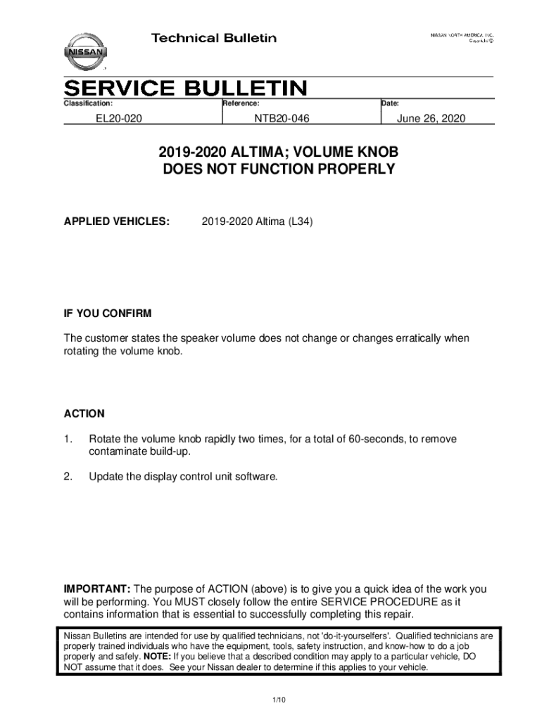 Classification:Reference:EL20020Date:NTB20046June 26, 202020192020 ALT IMA; VOLUME KNOB DOES NOT FUNCTION PROPERLYAPPLIED VEHICLES:20192020 Alma (L34)IF YOU CONFIRM The customer states the speaker