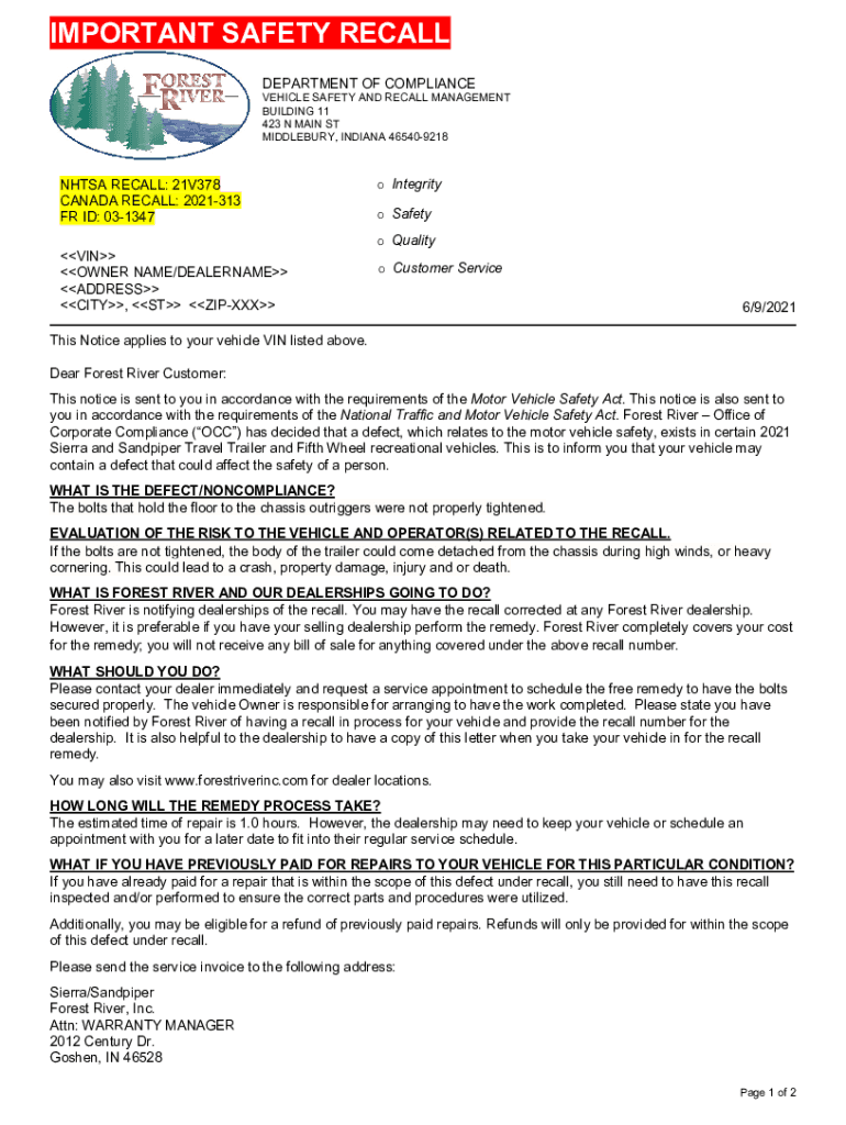 MIDDLEBURY, INDIANA 465409218NHTSA RECALL: 21V378