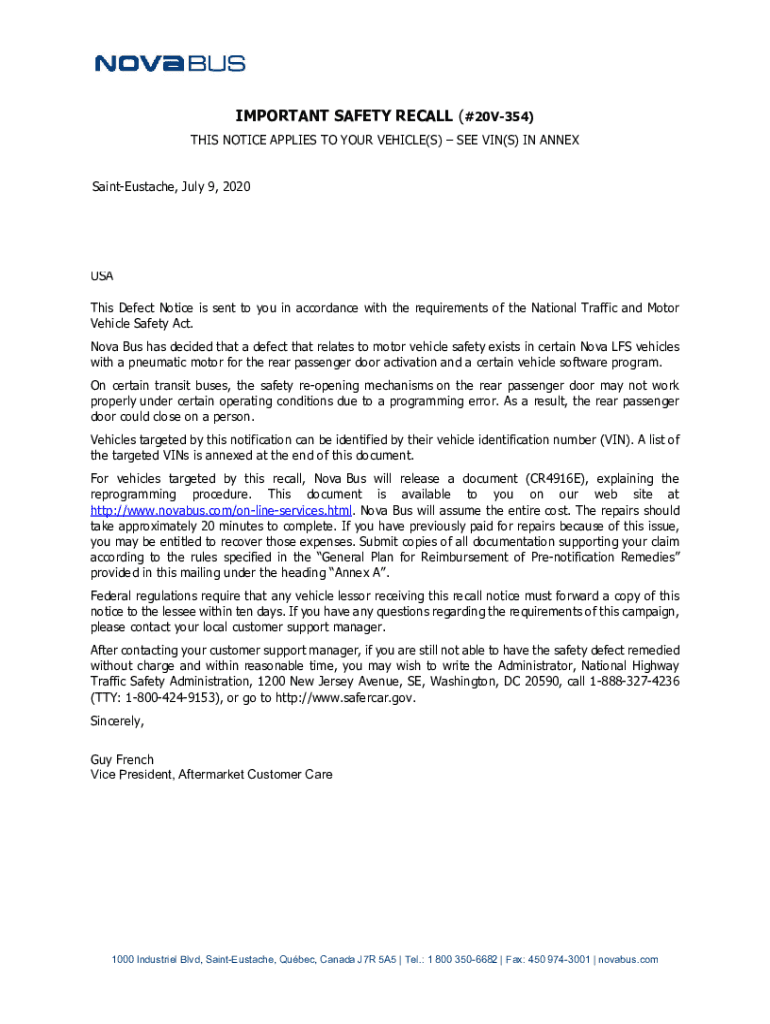 IMPORTANT SAFETY RECALL (#20V354) THIS NOTICE APPLIES TO YOUR VEHICLE(S) SEE VIN(S) IN ANNEX SaintEustache, July 9, 2020USA This Defect Notice is sent to you in accordance with the requirements of