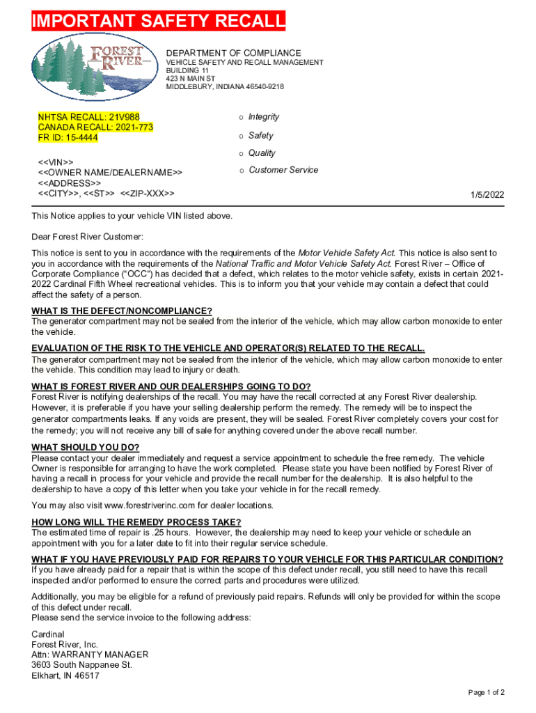 MIDDLEBURY, INDIANA 465409218NHTSA RECALL: 21V988
