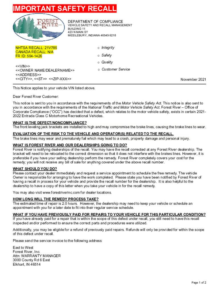 MIDDLEBURY, INDIANA 465409218NHTSA RECALL: 21V785