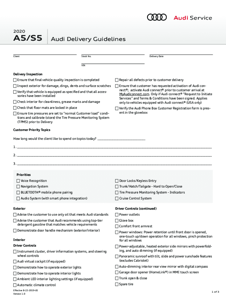 2020A5/S5Audi Delivery GuidelinesClientStock No. Delivery DateVINDelivery Inspection Ensure that final vehicle quality inspection is completed Repair all defects prior to customer delivery Inspect