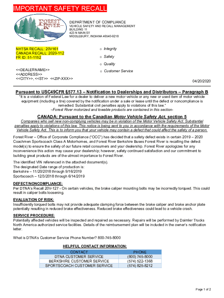 IMPORTANT SAFETY RECALL DEPARTMENT OF COMPLIANCEVEHICLE SAFETY AND RECALL MANAGEMENT BUILDING 11 423 N MAIN ST MIDDLEBURY, INDIANA 465409218NHTSA RECALL: 20V161 CANADA RECALL: 2020112 FR ID: 511152