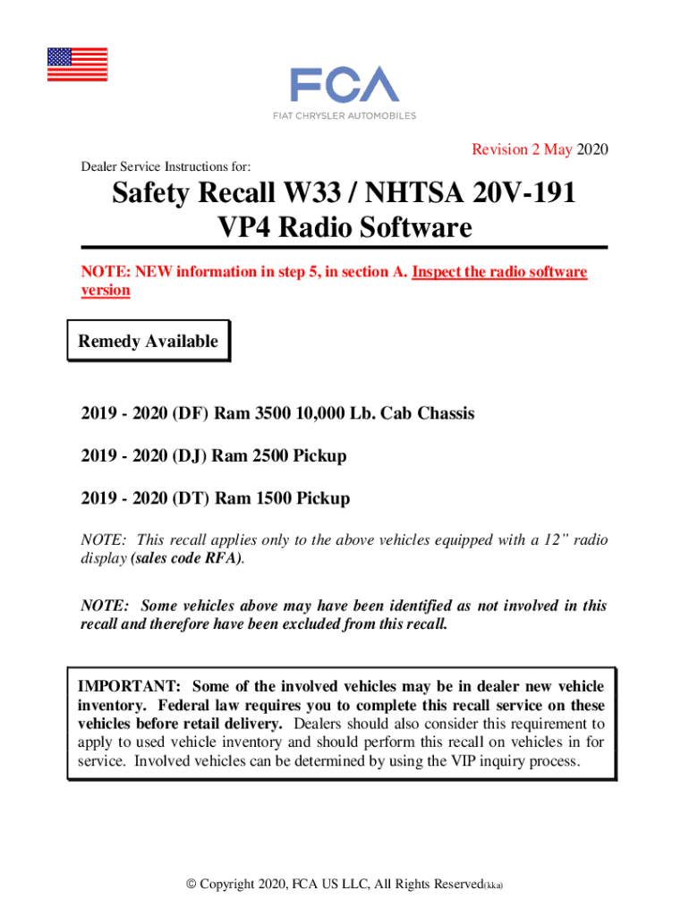Get the free Revision 2 May 2020 Safety Recall W33 / NHTSA 20V-191 VP4 Radio Software