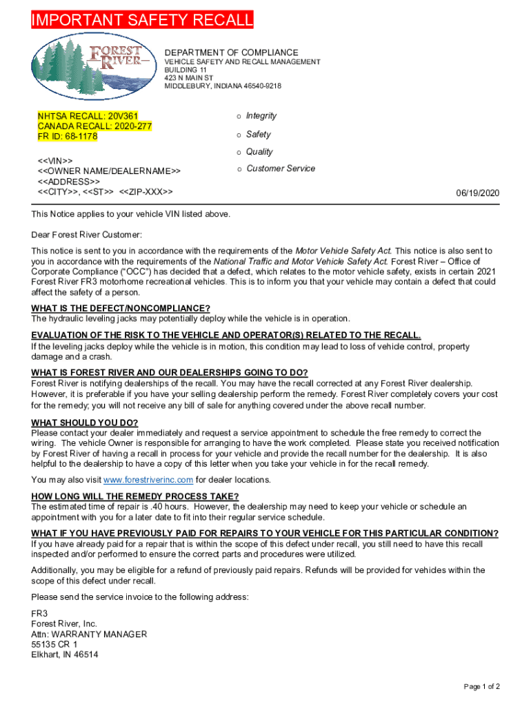 IMPORTANT SAFETY RECALL DEPARTMENT OF COMPLIANCEVEHICLE SAFETY AND RECALL MANAGEMENT BUILDING 11 423 N MAIN ST MIDDLEBURY, INDIANA 465409218NHTSA RECALL: 20V361 CANADA RECALL: 2020277 FR ID: 681178