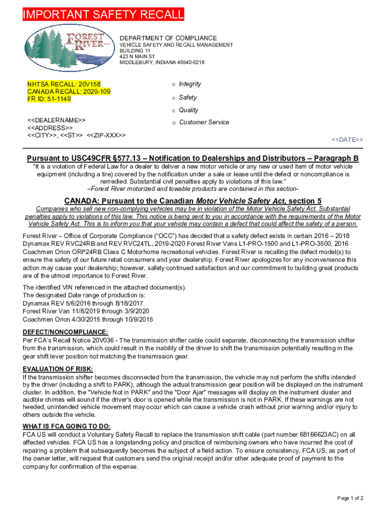 IMPORTANT SAFETY RECALL DEPARTMENT OF COMPLIANCEVEHICLE SAFETY AND RECALL MANAGEMENT BUILDING 11 423 N MAIN ST MIDDLEBURY, INDIANA 465409218NHTSA RECALL: 20V158 CANADA RECALL: 2020109 FR ID: 511149