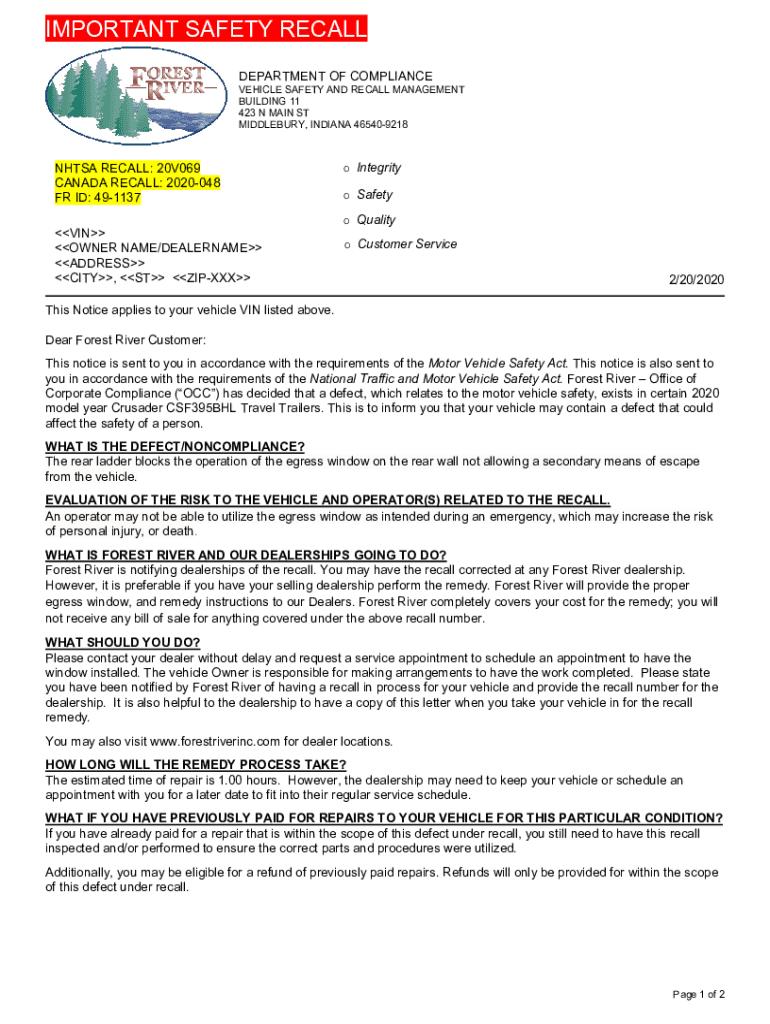 Get the free NHTSA RECALL: 20V069