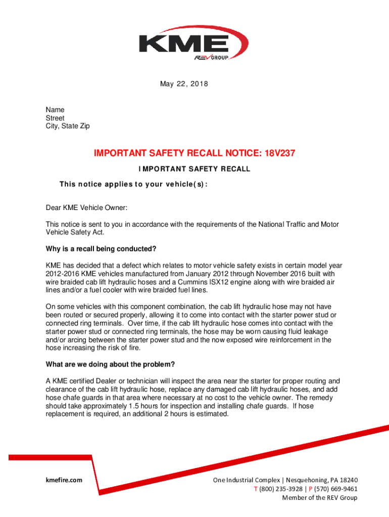 May 22, 2018Name Street City, State Important SAFETY RECALL NOTICE: 18V237 IMPORTANT SAFETY RECALL This notice applies to your vehicle(s): Dear ME Vehicle Owner: This notice is sent to you in accordance