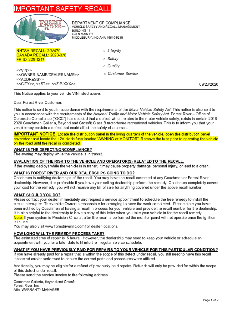 IMPORTANT SAFETY RECALL DEPARTMENT OF COMPLIANCEVEHICLE SAFETY AND RECALL MANAGEMENT BUILDING 11 423 N MAIN ST MIDDLEBURY, INDIANA 465409218NHTSA RECALL: 20V479 CANADA RECALL: 2020376 FR ID: 2251217