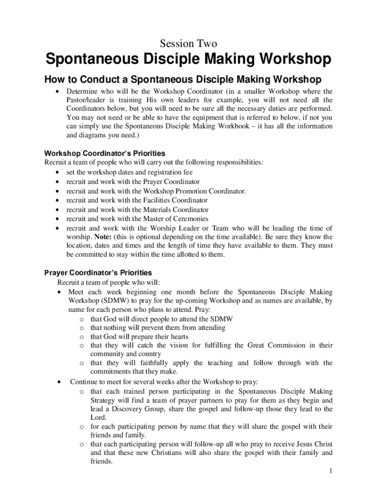 Session Spontaneous Disciple Making Workshop How to Conduct a Spontaneous Disciple Making Workshop Determine who will be the Workshop Coordinator (in a smaller Workshop where the Pastor/leader is